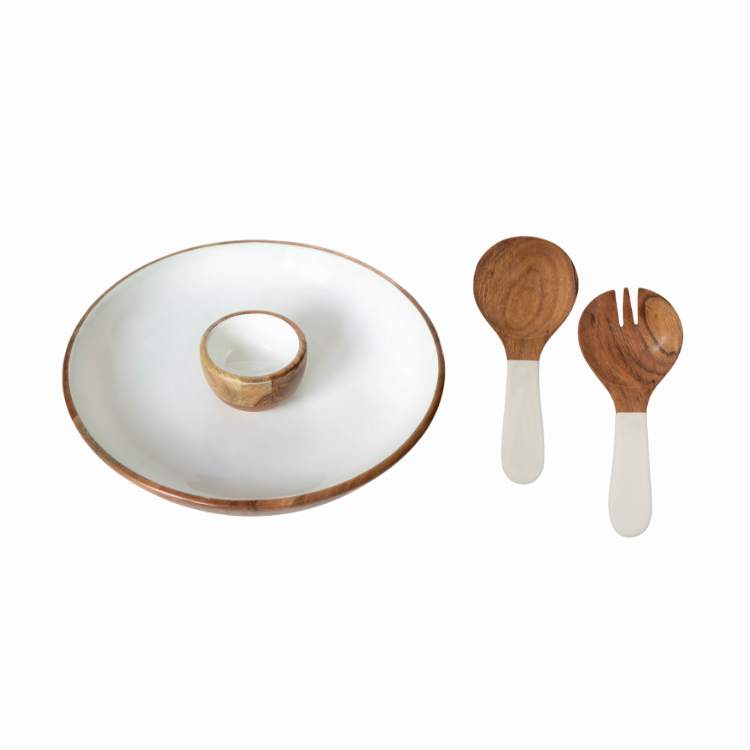 Toss, serve, and dress with style. This 3 piece bundle includes a large salad bowl, a matching dipping bowl for dressings or toppings, and a set of elegant salad servers—everything you need to make your greens the star of the table. Whether you're building a classic Caesar or a colorful farmers market mix, this set brings both function and flair to every salad course.