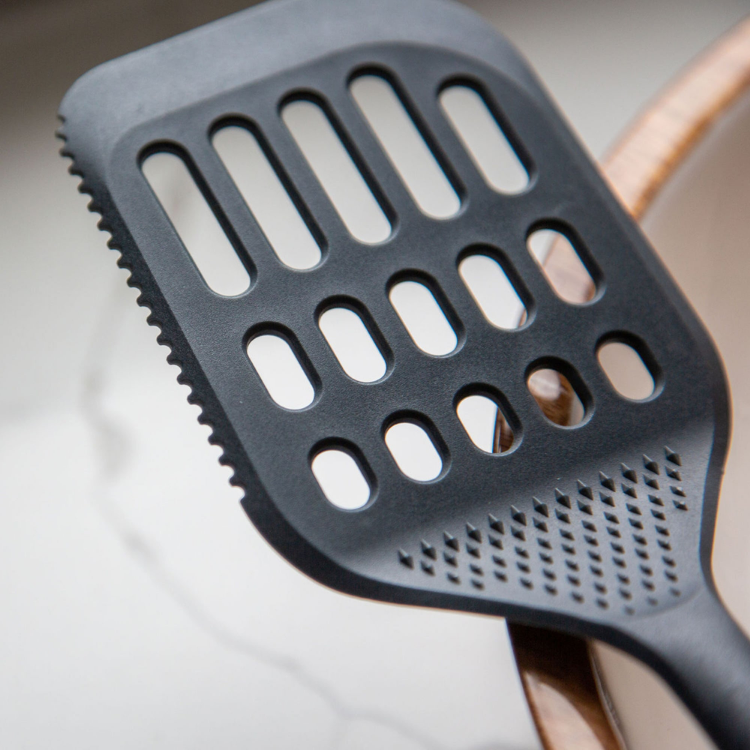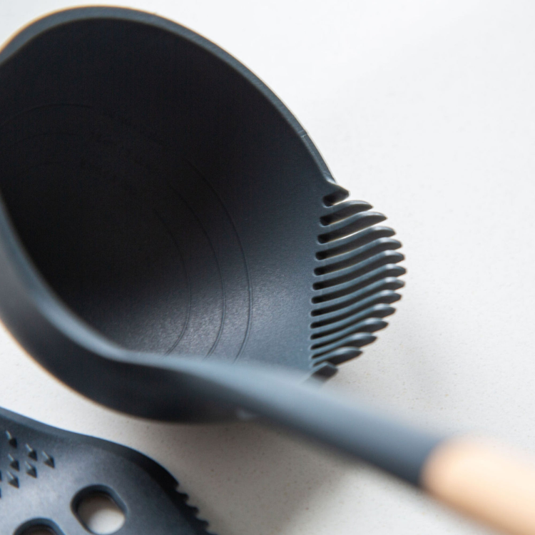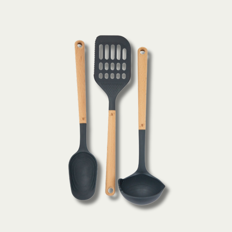 The Jeanne Fitz 3-piece kitchen utensil set is crafted to enhance cooking and baking with versatile, multi-functional tools. Each utensil features a high-quality beechwood handle and a durable nylon head, perfect for non-stick cookware. This BPA-free set includes a ladle, spoon, and spatula. The turner is equipped with a grating surface for nutmeg, garlic, and ginger, a curved edge for scraping bowls and pans, and a serrated edge for cutting meat and veggies.