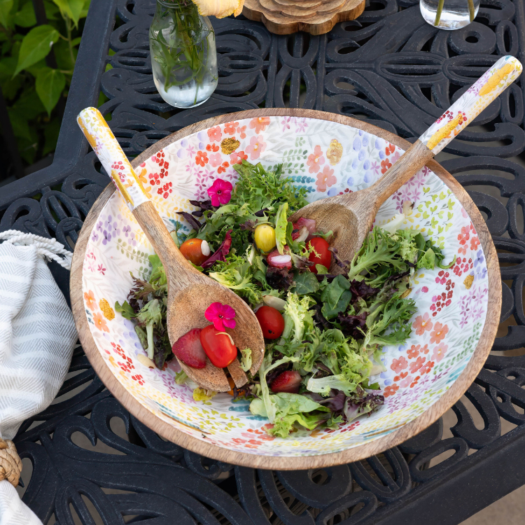 This gorgeous 14-inch natural mango wood bowl and salad server set is sure to be a wonderful addition to any gathering. The set is coated with a beautiful floral gold foil print that not only adds a unique finish but also ensures durability and easy maintenance. Perfect for serving salads, cold pasta, fruit, and more. The floral gold foil adds an organic touch that is perfect on any table. This set makes for a wonderful housewarming or bridal shower gift and coordinates with other pieces from our Wood + White Collection.