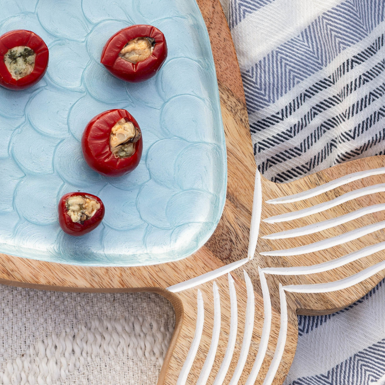 Bring the blissful serenity of the coast into your home with this charming Fish Platter. Made in India of durable study mango wood and handcrafted enamel, each tray is unique in texture. Perfect for serving small bites, desserts, or displayed as the perfect décor. Ideal for both indoor and outdoor entertainment. This creative yet functional tray is sure to be a conversation starter and standout at any gathering.