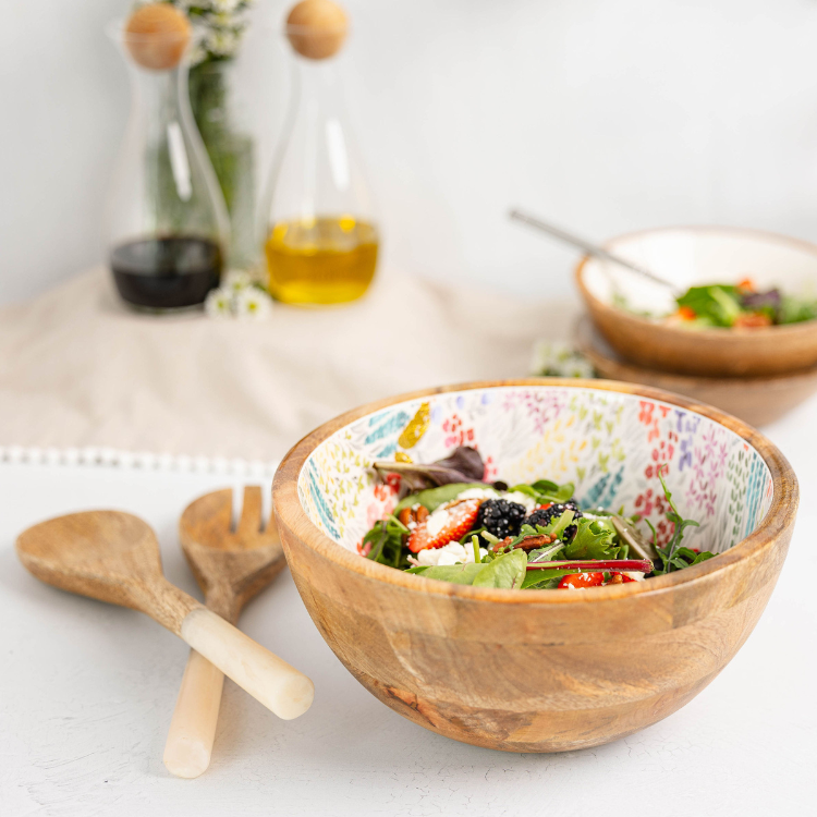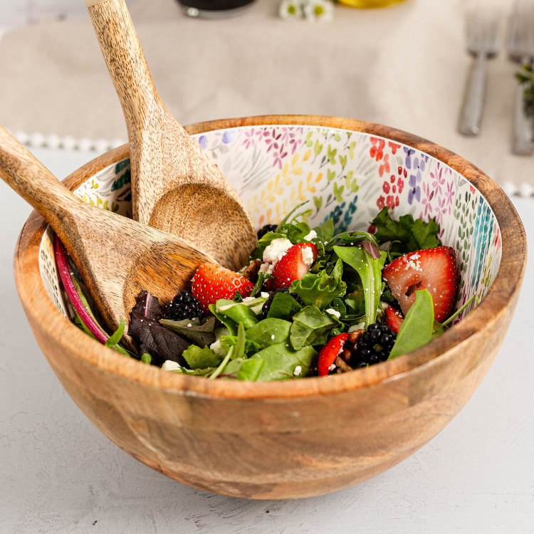 This gorgeous 14-inch natural mango wood bowl and salad server set is sure to be a wonderful addition to any gathering. The set is coated with a beautiful floral gold foil print that not only adds a unique finish but also ensures durability and easy maintenance. Perfect for serving salads, cold pasta, fruit, and more. The floral gold foil adds an organic touch that is perfect on any table. This set makes for a wonderful housewarming or bridal shower gift and coordinates with other pieces from our Wood + White Collection.