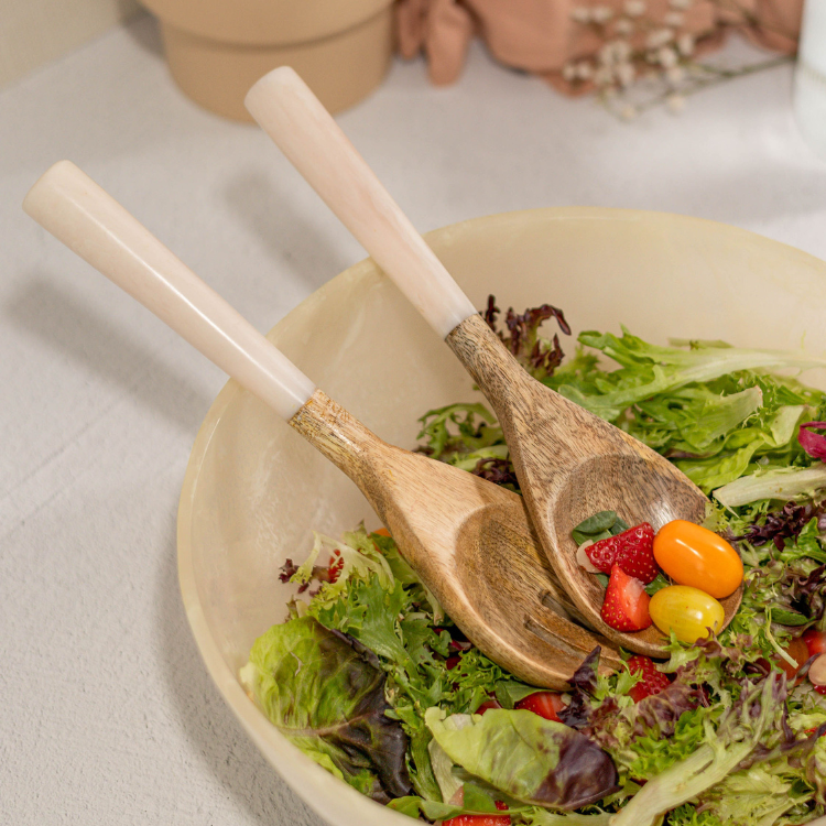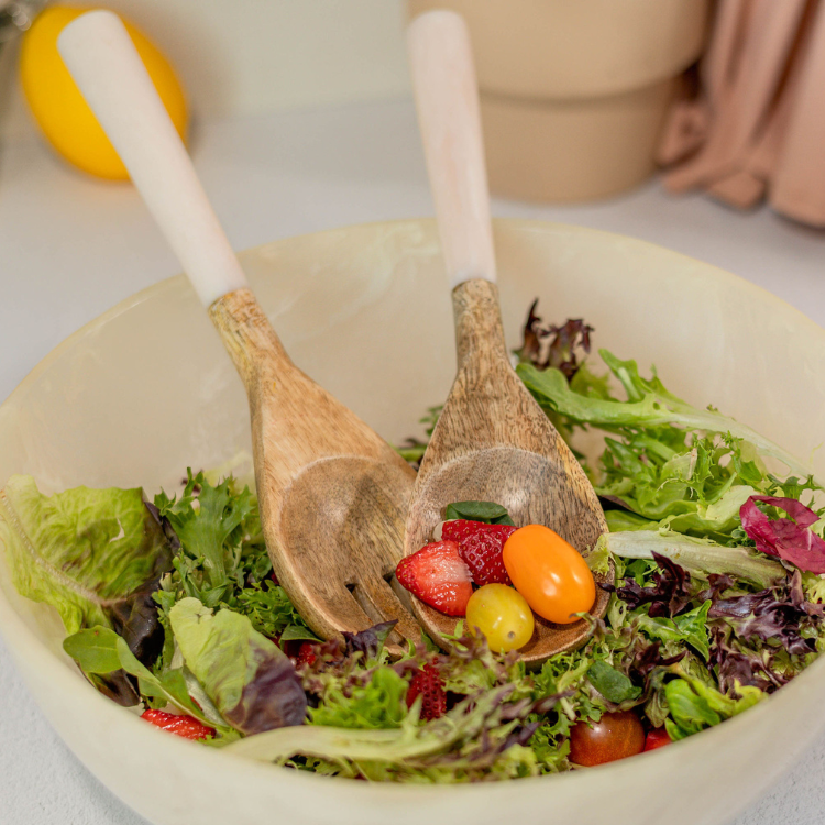 - Resin Salad Servers: Coordinated in color and craftsmanship, these sleek servers ensure easy tossing and serving while complementing the bowl’s organic silhouette.